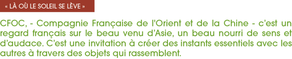 Depuis sa création, l’entreprise a su tisser des liens indéfectibles avec des artisans engagés, établis dans une douzaine de pays, allant du Japon à l’Inde, en passant par la Chine, le Vietnam et l’Indonésie… Supprimant les intermédiaires, la CFOC chérit ces relations et s’attache à mettre en lumière l’identité culturelle de chaque pays. Ainsi, l’art de la verrerie soufflée à la bouche, de la céramique magnifiée à la main, du tissage minutieux, de la laque, brillante signature de la maison sont mis au service de la table… Une table de partage à la quintessence hors du temps et sans frontières.