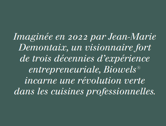 Dans un monde où les consommables professionnels sont dominés par les plastiques et les solutions jetables peu respectueuses de l’environnement, Biowels® a vu le jour. Au cœur de la Normandie, dans son usine NOVAGREEN TECHNOLOGIES®, l’entreprise développe et fabrique des alternatives innovantes aux consommables polluants, destinées aux secteurs de l’hôtellerie, de la restauration et des métiers de bouche. Sa gamme comprend des produits recyclables ou compostables qui remplacent les linges traditionnels et les consommables plastiques : serviettes ou torchons compostables, films étirables alimentaires et sacs poubelles compostables. L’entreprise maintient son engagement à proposer des alternatives durables, en alliant qualité et efficacité sans compromis.