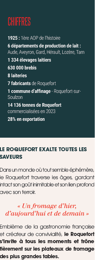 Premier ambassadeur des terroirs français, le Roquefort porte en lui l’héritage de la première Appellation d’Origine Protégée de l’histoire. Au pied du Combalou, des générations d’hommes et de femmes se sont engagées corps et âme pour préserver ce trésor unique, inspirant tout un univers fromager à poursuivre la quête de reconnaissance et d’authenticité. Sur les terres rocailleuses du sud du Massif Central, les brebis Lacaune, véritable emblème de ce territoire, paissent patiemment. De retour à la bergerie, elles sont friandes du fourrage des prés et de céréales provenant au moins à 80% de la ferme. Leur lait, recueilli avec soin deux fois par jour, entame une transformation méticuleuse et empreinte de tradition. Dans les caves de Roquefort-sur-Soulzon, à l’ombre des parois millénaires, le caillé s’épanouit lentement, pendant au moins 14 jours, bercé par l’air frais et humide, pour révéler ses arômes intenses. Plus qu’un fromage, le Roquefort est une promesse : celle d’une agriculture durable et responsable, fondée sur la transmission et le respect des savoir-faire, à la croisée des hommes et de la nature