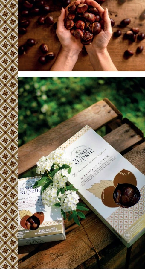 Choisir la Maison Sudrie, c’est avoir la garantie de savourer des châtaignes au goût intense 100 %« made in Nouvelle-Aquitaine ». Produites en Corrèze, elles sont ensuite transformées dans des ateliers en Dordogne. Un choix de raison au service du goût… Ici, les méthodes de production se veulent responsables et éthiques et les châtaignes récoltées à la main sont minutieusement sélectionnées. Naturels à cœur, les produits transformés sont quant à eux, sans additifs ni conservateurs et exhalent leur goût originel grâce à un savoir-faire artisanal. Ainsi, les marrons sont décortiqués à la flamme et sont ensuite triés puis cuits sous vide à la vapeur et emballés, le tout en parfaite conformité avec les exigences de la certification IFS.