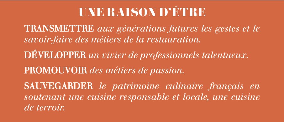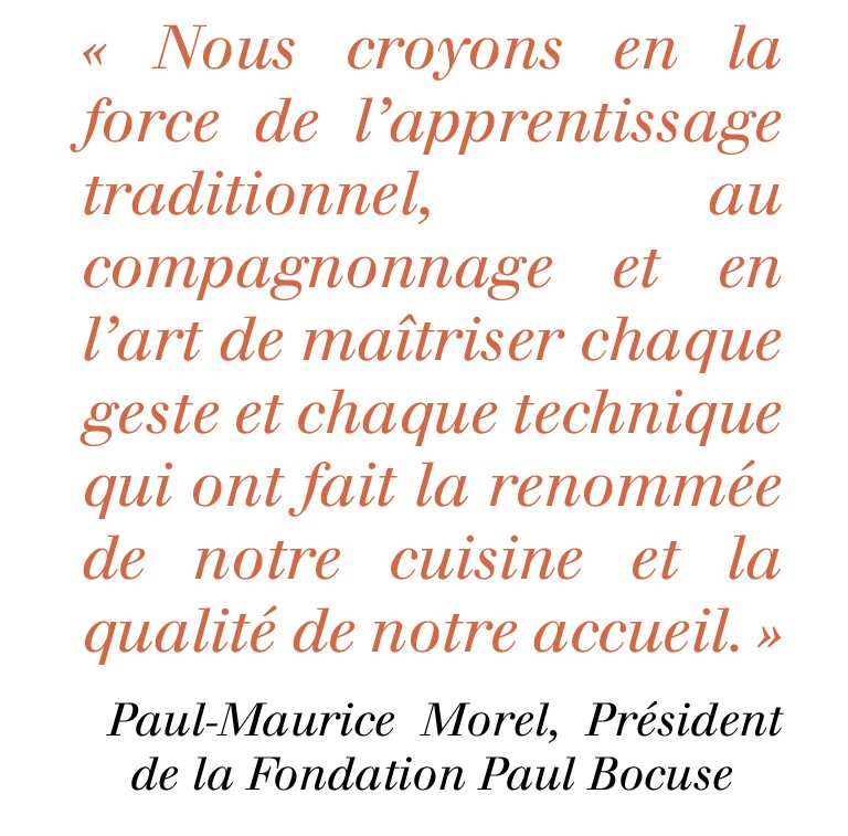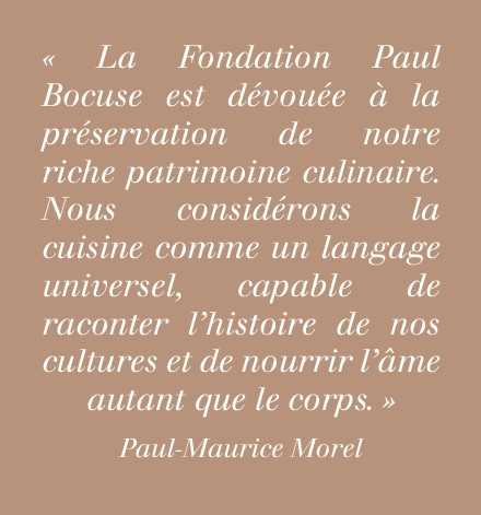 Créée en 2004, la Fondation Paul Bocuse a pour objectif la transmission des savoirs aux nouvelles générations, à travers l’échange et le partage de la passion des métiers de bouche. La Fondation œuvre au quotidien pour l’insertion et la réinsertion professionnelle dans un secteur d’activité aujourd’hui très marqué par une crise des vocations.