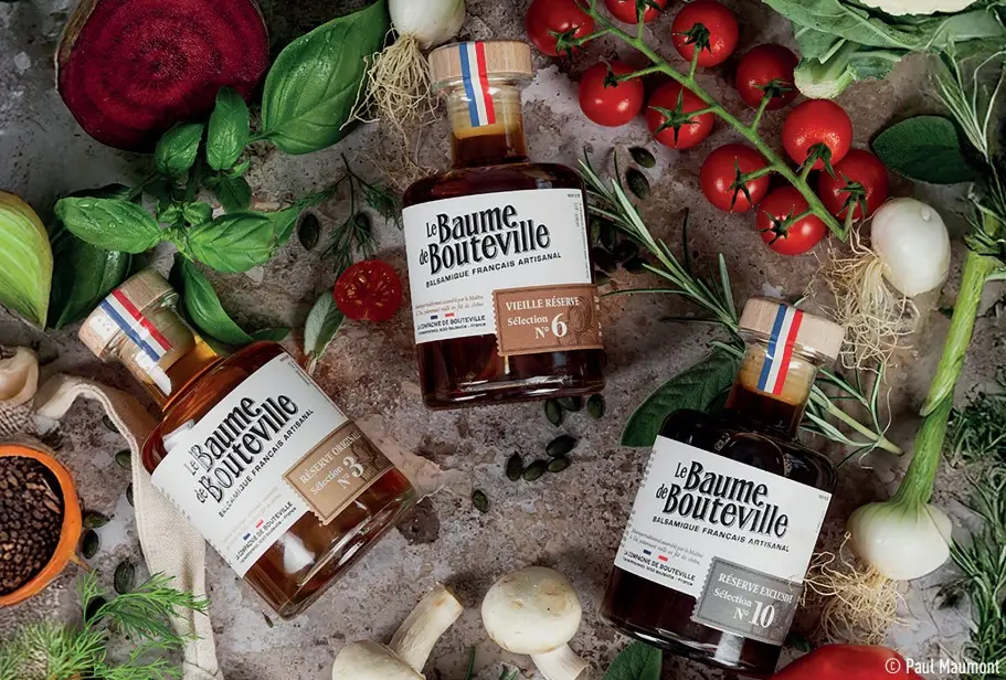 Le Baume de Bouteville, l’élégance en flacon, réinvente l’art du condiment avec un équilibre parfait entre concentration et douceur avec un affinage plus ou moins long de 3 à 10 ans. Inspiré des techniques italiennes mais libéré de tout excès sucré, il préserve la richesse des arômes pour sublimer sans masquer. La Réserve Originale N°3 offre des notes poivrées et fruitées, idéales pour des volailles raffinées ou des salades audacieuses. La Vieille Réserve N°6, complexe et moelleuse, dévoile des touches d’agrumes, de noix et de châtaigne, parfaites pour un magret ou des Saint-Jacques. Enfin, la Réserve Exclusive N°10, véritable joyau de patience, mêle prune, fruits confits et le fameux « Rancio » des grands Cognacs, sublimant en un tour de main un carpaccio de bœuf, un homard ou une simple salade de fraises.