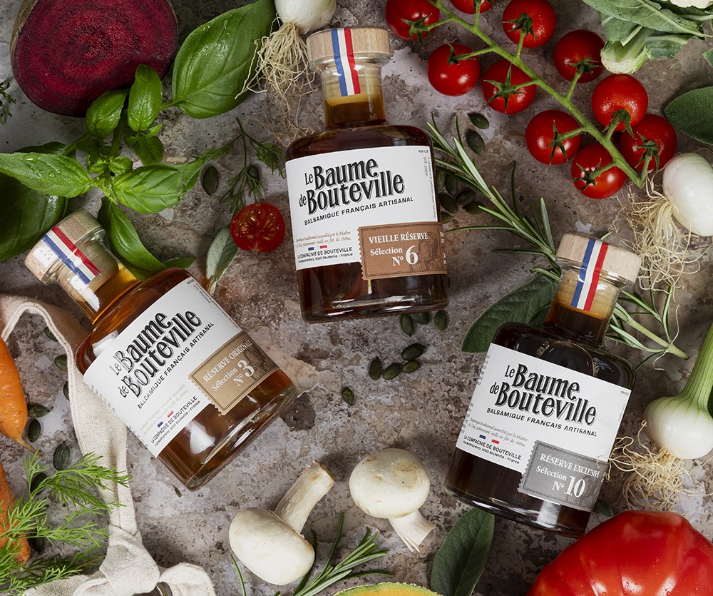 Le Baume de Bouteville, l’élégance en flacon, réinvente l’art du condiment avec un équilibre parfait entre concentration et douceur avec un affinage plus ou moins long de 3 à 10 ans. Inspiré des techniques italiennes mais libéré de tout excès sucré, il préserve la richesse des arômes pour sublimer sans masquer. La Réserve Originale N°3 offre des notes poivrées et fruitées, idéales pour des volailles raffinées ou des salades audacieuses. La Vieille Réserve N°6, complexe et moelleuse, dévoile des touches d’agrumes, de noix et de châtaigne, parfaites pour un magret ou des Saint-Jacques. Enfin, la Réserve Exclusive N°10, véritable joyau de patience, mêle prune, fruits confits et le fameux « Rancio » des grands Cognacs, sublimant en un tour de main un carpaccio de bœuf, un homard ou une simple salade de fraises.