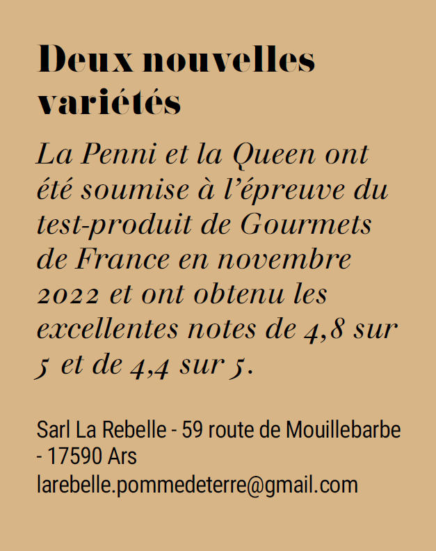 Longtemps réservée à l’autoconsommation, la pomme de terre est aujourd’hui l’un des joyaux de l’agriculture maraîchère de l’Ile de Ré. Parmi ses ambassadeurs les plus emblématiques, La Rebelle, marque indépendante née en 2011, incarne l’excellence et la tradition. Imaginée par Frédéric Héraudeau et Kevin Bourqui, cette pépite de la terre rétaise séduit par son authenticité et ses saveurs incomparables.