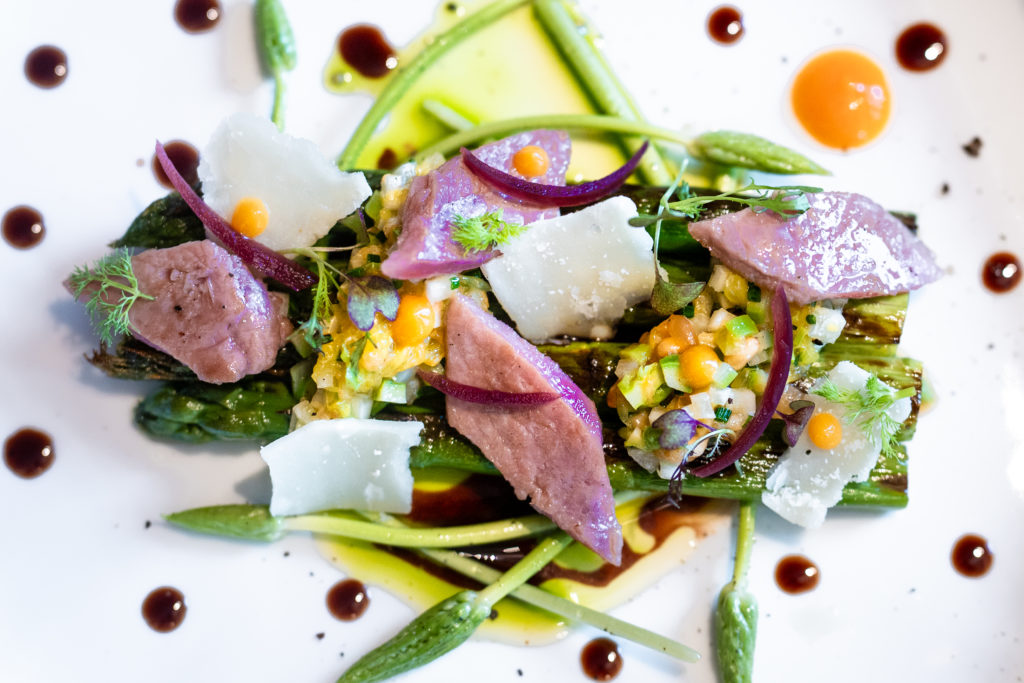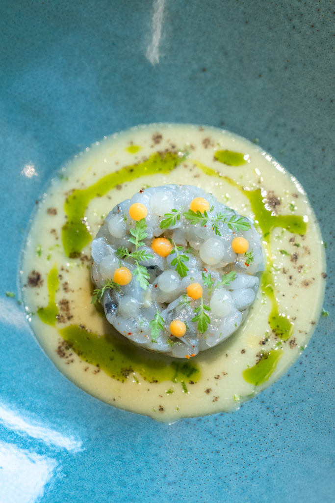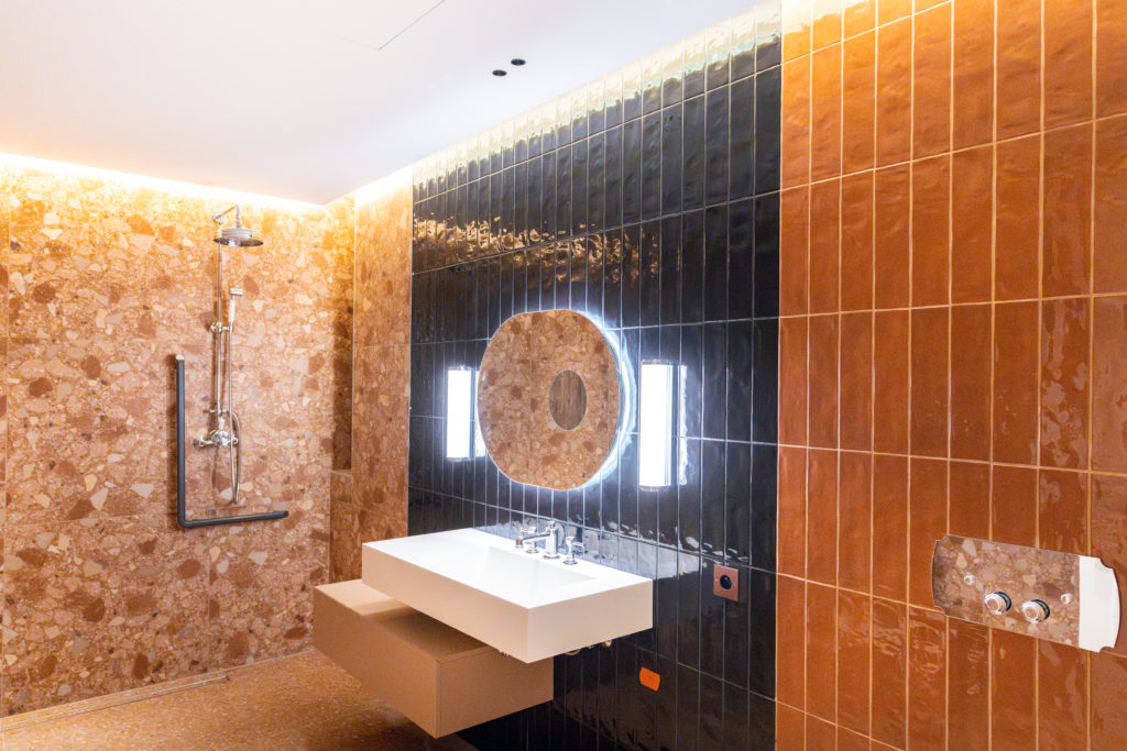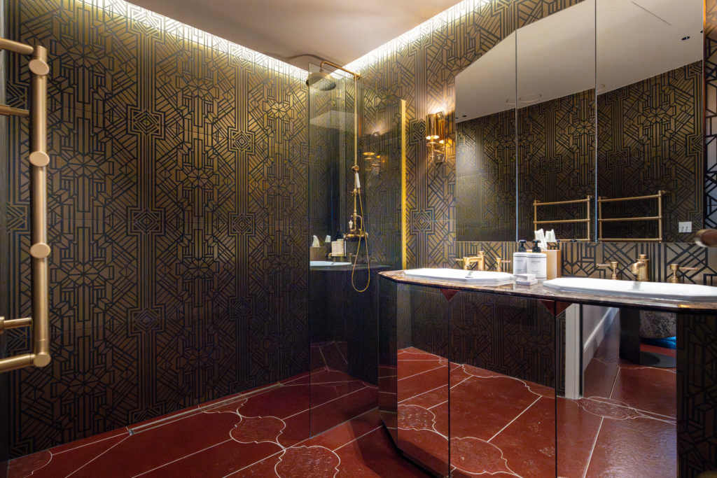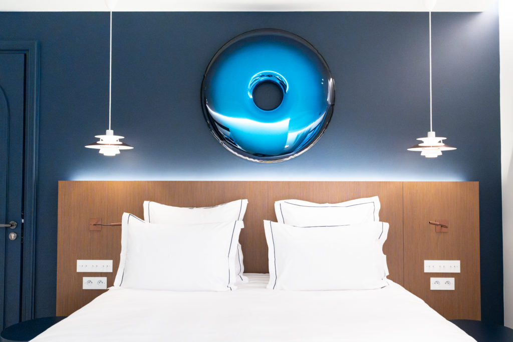 Dès les premiers pas, l’élégance se chuchote, se glisse dans la lumière, caresse les matières et épouse les formes. Sylvie Ranger, amoureuse de design, insuffle à chaque espace une aura vibrante. Dans le hall, la scénographie joue les contrastes sensibles avec un sol en carreaux de terre cuite italiens qui se patinent patiemment, des luminaires majestueux signés Thierry Vidé, sans oublier la pierre d’Egypte qui habille l’escalier. La salle de restaurant, elle, dévoile une sobriété raffinée aux tonalités bleu-gris, avec des tables bistro en bois chaud, des banquettes cuir tendues et en apesanteur, « Les larmes du pêcheur » de Ingo Maurer, qui suspend le souffle. Au bar, on apprécie le quartz dépoli qui offre ses veinures au toucher cuir, tandis que les tabourets Precious tiennent le rôle d’icônes silencieuses. Puis viennent les couloirs qui se parent de tapisseries damassées sur mesure où l’art de la suggestion assumée se fait clin d’œil au passé sulfureux du château. Les 18 chambres et suites, elles, sont de vrais cocons raffinés et contemporains qui se déclinent en 5 univers, faisant la part belle aux artisans et designers italiens. Au sommet, les Suites Deluxe se révèlent en un tableau terre & mer, fait de bleus profonds et de tons sauvages. Plus bas, l’atmosphère se fait tantôt sobre et épuré, tantôt théâtrale, avec la suite Gatsby tout en dorures et miroirs biseautés – clin d’œil à Sacha Guitry -, tantôt Girl Power avec sa chambre rose, joyau flamboyant, audacieux, presque évanescent. Finalement, en rez-de-jardin, les suites adoptent une douceur végétale, minérale, en écho au paysage alentour. Un art de vivre cousu main, orchestré avec audace et cohérence, où chaque pièce raconte une histoire, chaque détail fait sens.