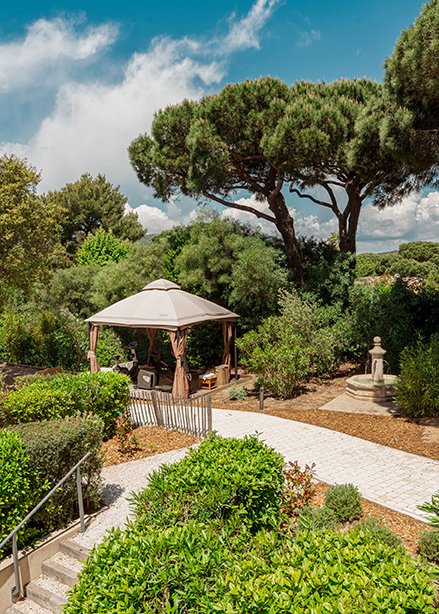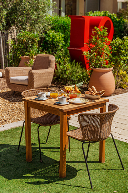 Entre pinède et mer, l’hôtel L’Escalet cultive la simplicité et la joie de recevoir. Dans ce havre confidentiel empreint de charme, le temps suspend son vol entre plongeons, siestes à l’ombre, déjeuners sur le pouce et apéritifs improvisés. Ici, la vie se savoure en extérieur. Tout au long de la journée, au rythme des sonorités lounge et festives, on apprécie la belle et grande piscine chauffée d’un bleu azur, autant que les innombrables bains de soleil en bois et ses parasols taupe qui en clairsèment les abords. L’accent est mis sur les matières chaudes ainsi que les couleurs douces et naturelles qui se fondent parfaitement à la nature environnante. Çà et là, la végétation endémique s’épanouit sous les embruns du midi, côtoyant dans un joli contraste les jarres artisanales en terre cuite de Goïcoechea. On aime volontiers se prélasser dans les salons de jardin en rotin, peuplés de coussins chamarrés ou encore profiter de l’espace Zen et de ces deux lits cocons, au son du doux clapotis de la fontaine. Quelques suspensions en fibres naturelles et guirlandes lumineuses viennent ajouter une touche bohème à la scène. Pour ceux qui ont un peu d’énergie à revendre, le terrain de pétanque et l’espace fitness complètent cette parenthèse ensoleillée.
