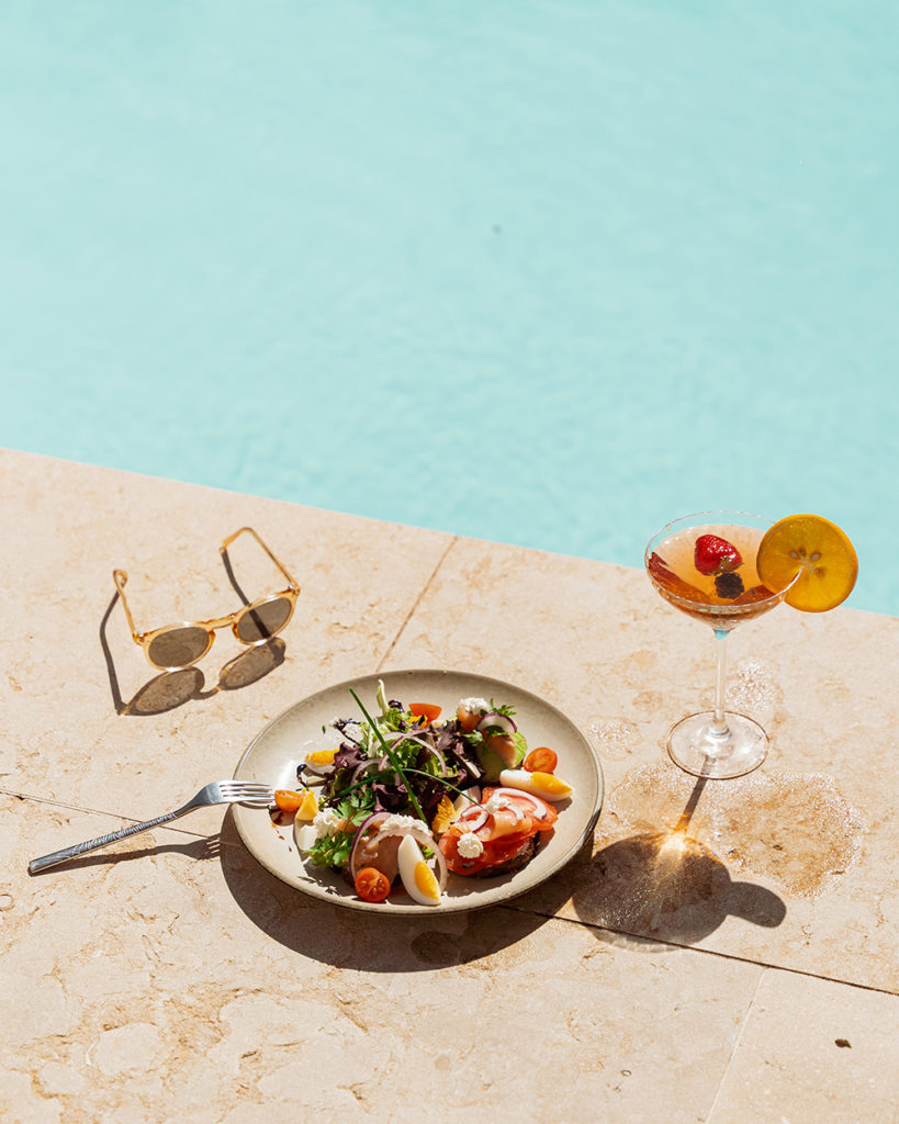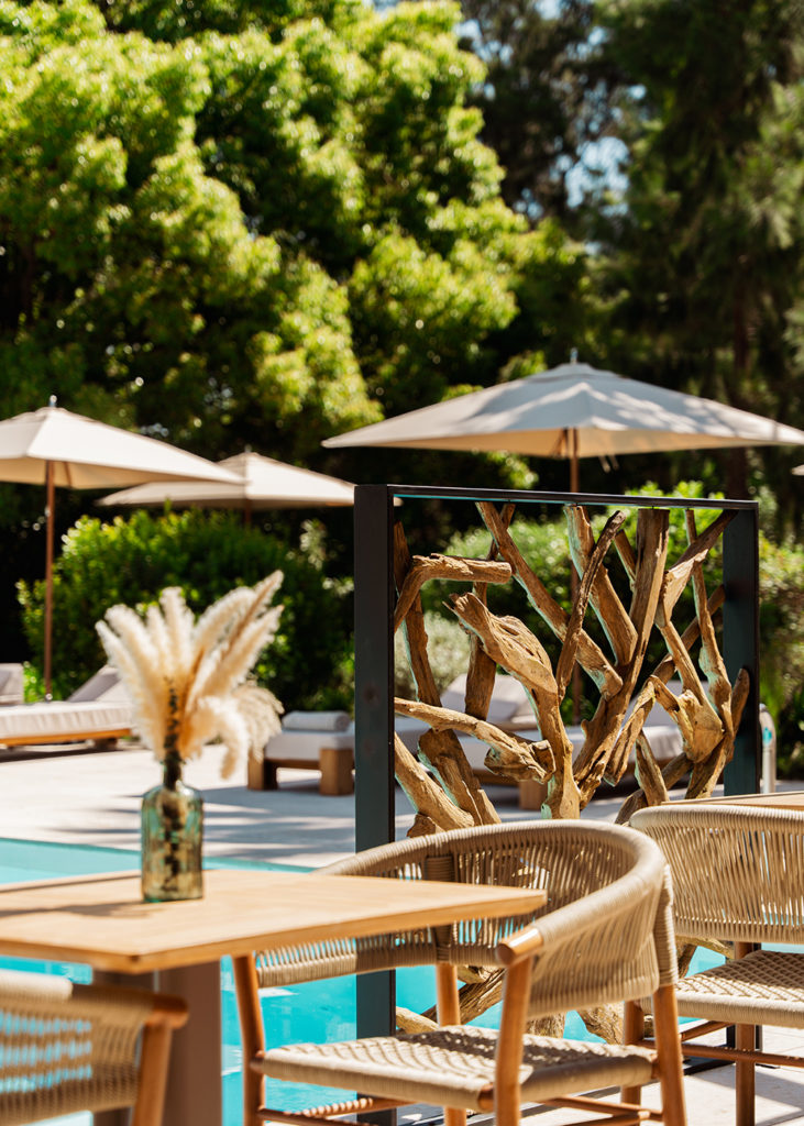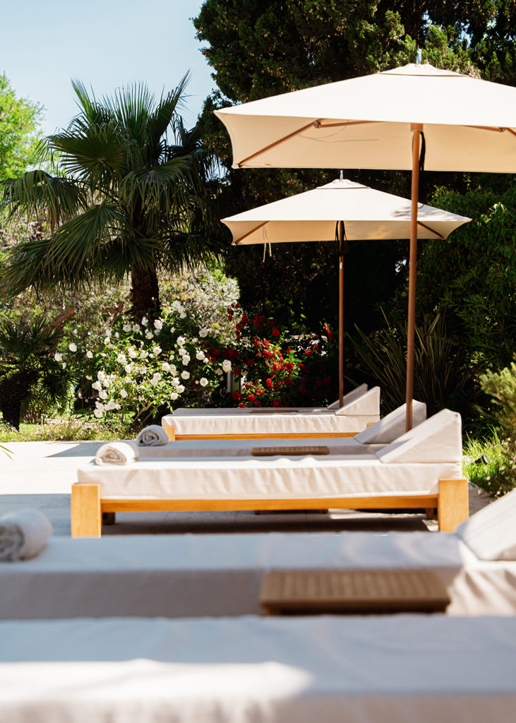 Hôtel 4 étoiles au cadre intimiste, la Bastide des Salins invite à une parenthèse douce, presque initiatique. Dès que l’on franchit le grand portail en fer forgé, le silence s’impose comme un luxe enveloppant, signant le début d’un éden de sérénité. L’accueil chaleureux, rappelle celui d’une maison de famille que l’on retrouve avec bonheur. On se sent bien, déconnecté. On pose ses valises et on respire. Sur le pourtour de la piscine chauffée, un cocktail de fruit frais à la main, on laisse filer le temps. Les beds en bois clair, couronnés de parasols aux tonalités beige, ne sont pas sans rappeler le sable chaud des salins. Les jardins arboré et luxuriant, eux, invitent à la flânerie, laissant le temps s’égrainer à la clameur de l’été. Sous les palmiers, platanes, eucalyptus et autres essences exotiques, de petites alcôves aménagées permettent de savourer l’instant, un livre à la main ou en partageant une planche de dégustation.